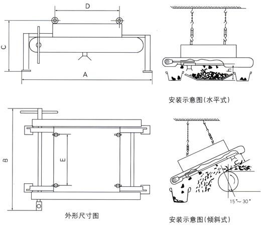 型號\參數\項目 | 適應帶寬 mm | 額定吊高 h=mm | 物料厚度 ≤mm | 磁場強度 ≥mT | 適應帶速 ≤m/s | 重量 kg | 外形尺寸 A×B×C | 懸掛尺寸 D×E |